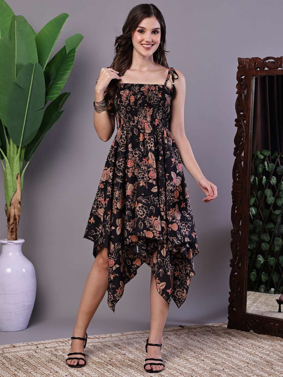 Effortlessly stylish dress with a vibrant abstract print, tie-up shoulder straps, and a chic high-low handkerchief hemline ? perfect for casual days or evening gatherings.